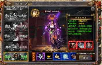 1、开服750天后,开启演武场副本玩法,演武场副本为个人副本,副本挑战时限为30分钟,每日有三次挑战次数,副本内怪物会掉落武道装备以及武道相关道具